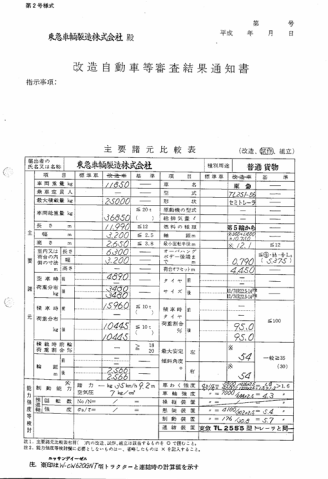 車体の形状 ━ 平成05年11月 普通 貨物 ━ セミトレーラ 車名 乗車定員 最大積載量 車両重量 車両総重量 国産車その他 ━ 25,000kg 11,670kg 36,670kg 車台番号 長さ 幅 高さ 前前軸重 前後軸重 後前軸重 後後軸重 福[91]***116福 1,244cm 320cm 267cm ━ ━ ━ ━ 車両型式 エンジン型式 排気量 燃料 型式指定番号 類別区分番号 -TL25156 ━ ━ ━ ━ ━ 所有者の氏名又は名称 *** 所有者の住所 *** 使用者の氏名又は名称 *** 使用者の住所 *** 使用の本拠の位置 *** 有効期限の満了する日 抹消 備考