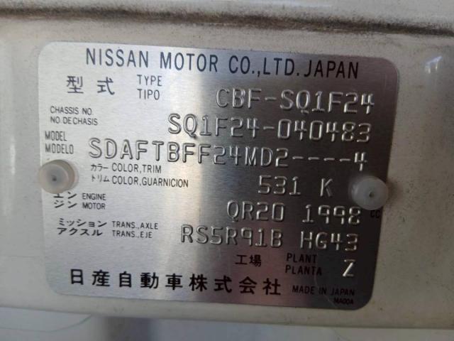 車体の形状 ━ 平成28年10月 小型 貨物 自家用 バン 車名 乗車定員 最大積載量 車両重量 車両総重量 ニッサン 3人 1,500kg 1,850kg 3,515kg 車台番号 長さ 幅 高さ 前前軸重 前後軸重 後前軸重 後後軸重 SQ1F24-***483 452cm 169cm 198cm 1,030kg ━ ━ 820kg 車両型式 エンジン型式 排気量 燃料 型式指定番号 類別区分番号 CBF-SQ1F24 QR20 1.99L ガソリン ━ ━ 所有者の氏名又は名称 *** 所有者の住所 *** 使用者の氏名又は名称 *** 使用者の住所 *** 使用の本拠の位置 *** 有効期限の満了する日 抹消 備考