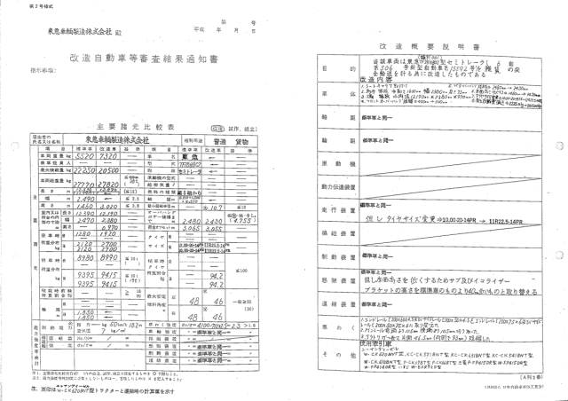 車体の形状 ━ 平成07年08月 普通 貨物 事業用 セミトレーラ 車名 乗車定員 最大積載量 車両重量 車両総重量 国産車その他 ━ 20,900kg 7,060kg 27,960kg 車台番号 長さ 幅 高さ 前前軸重 前後軸重 後前軸重 後後軸重 TF28HC2-***147 1,295cm 249cm 306cm 1,830kg ━ 2,620kg 2,610kg 車両型式 エンジン型式 排気量 燃料 型式指定番号 類別区分番号 -TF28H8C2 ━ ━ ━ ━ ━ 所有者の氏名又は名称 *** 所有者の住所 *** 使用者の氏名又は名称 *** 使用者の住所 *** 使用の本拠の位置 *** 有効期限の満了する日 抹消 備考